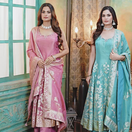 Elevate your festive wardrobe with this elegant Anarkali palazzo set featuring rich jacquard floral motifs and a graceful flare. The sleeveless Anarkali kurta is beautifully detailed with an intricate neckline and traditional woven patterns that enhance its royal look. Paired with a matching palazzo and a coordinated dupatta with a detailed border, this outfit is perfect for weddings, festive occasions, and celebrations.