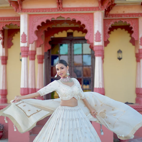 Step into elegance with this stunning ivory lehenga set, designed with graceful zari embroidery that gives a rich and timeless look. The beautifully detailed blouse features delicate thread and zari work, perfectly paired with a flowing lehenga that creates a royal silhouette.