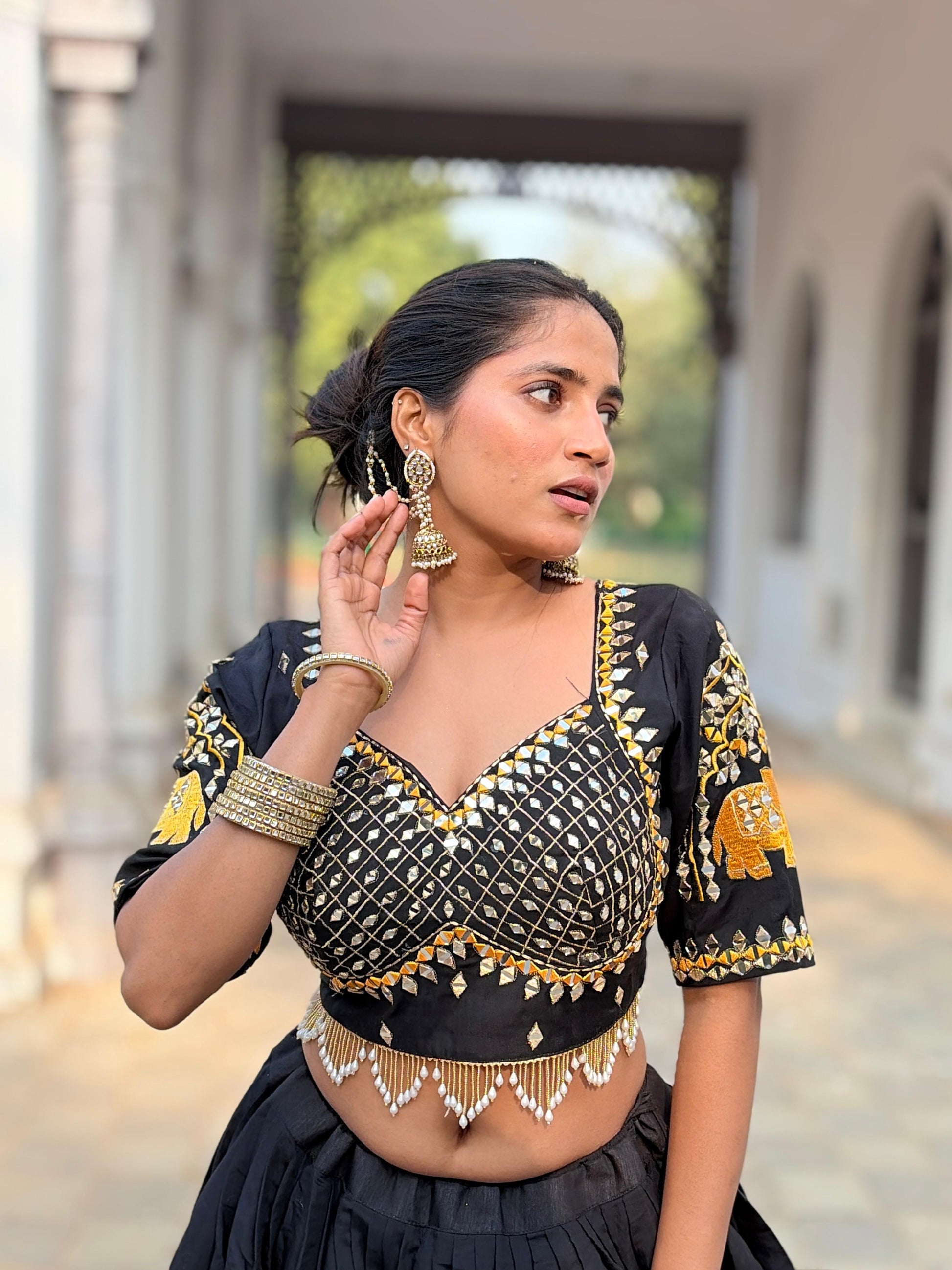 Celebrate wedding garba nights in timeless elegance with this beautifully embroidered lehenga choli. Featuring traditional elephant motifs and rich mirror detailing, this outfit is perfect for pre-wedding functions, Navratri, and festive occasions.