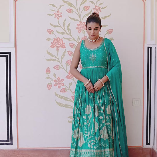 Step into timeless elegance with this graceful teal green Anarkali set, designed for celebrations that demand effortless charm.