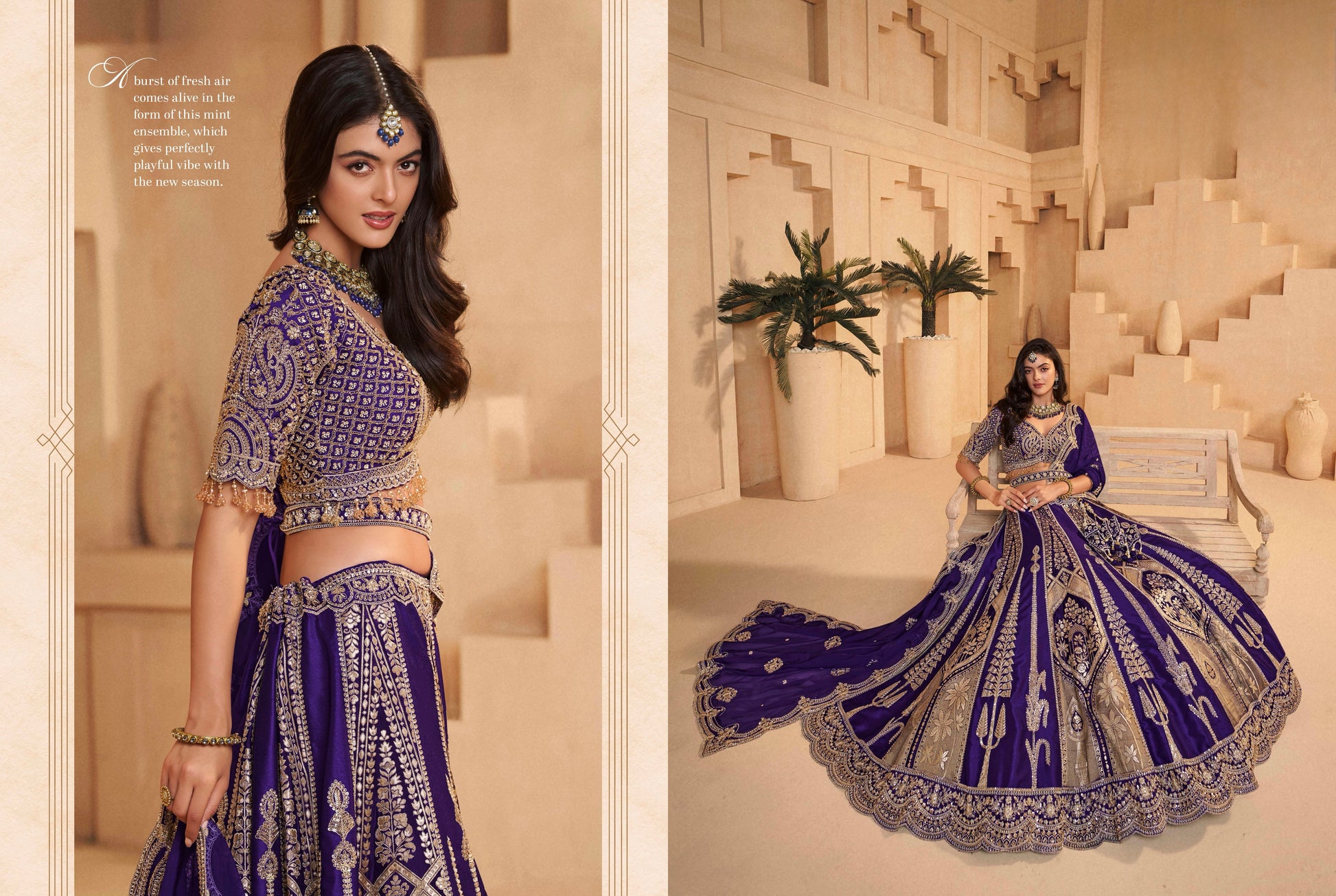 - Grand flared lehenga with detailed border work